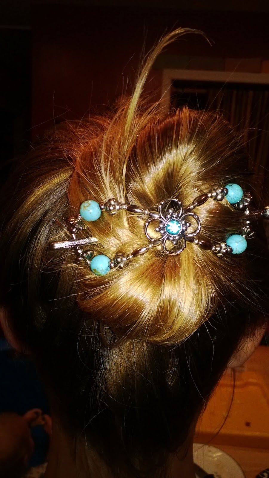 Now, Cowgirl inherited my hair, she looks just like her father but has my hair. As a child, the barrettes would literally slide out of my hair before your very eyes. So getting anything to stay in her hair is a thrill. The clip was a little too heavy to hold in just a ponytail, although I think a smaller clip would work fine. However, it stayed beautifully in all the other updos all by itself. Usually to keep Cowgirl's hair in a twist or bun, I need to pull it into a ponytail with a hairtie, then use at least 6 bobby pins to pin down the style, spray it with hairspray and hope it will hold for more than an hour. With buns, I usually put an additional hairtie around the outside of the bun. She enjoyed having so little in her hair and no hair pulled by plastics nor bobby pins poking into her scalp. In fact, the only thing that shook the clip lose was her second change at co-op when she went from ballet clothes back to her regular outfit. She has worn the clip everyday this week and has only taken it out when she decides to do more experimenting with hair styles. Normally, I would spend time doing her hair only to see it out twenty minutes later because either the hair didn't stay or she couldn't stand everything that was holding her hair in place and pulled it out herself. In fact, the only negative I have to share is I wish these clips weren't made in China.